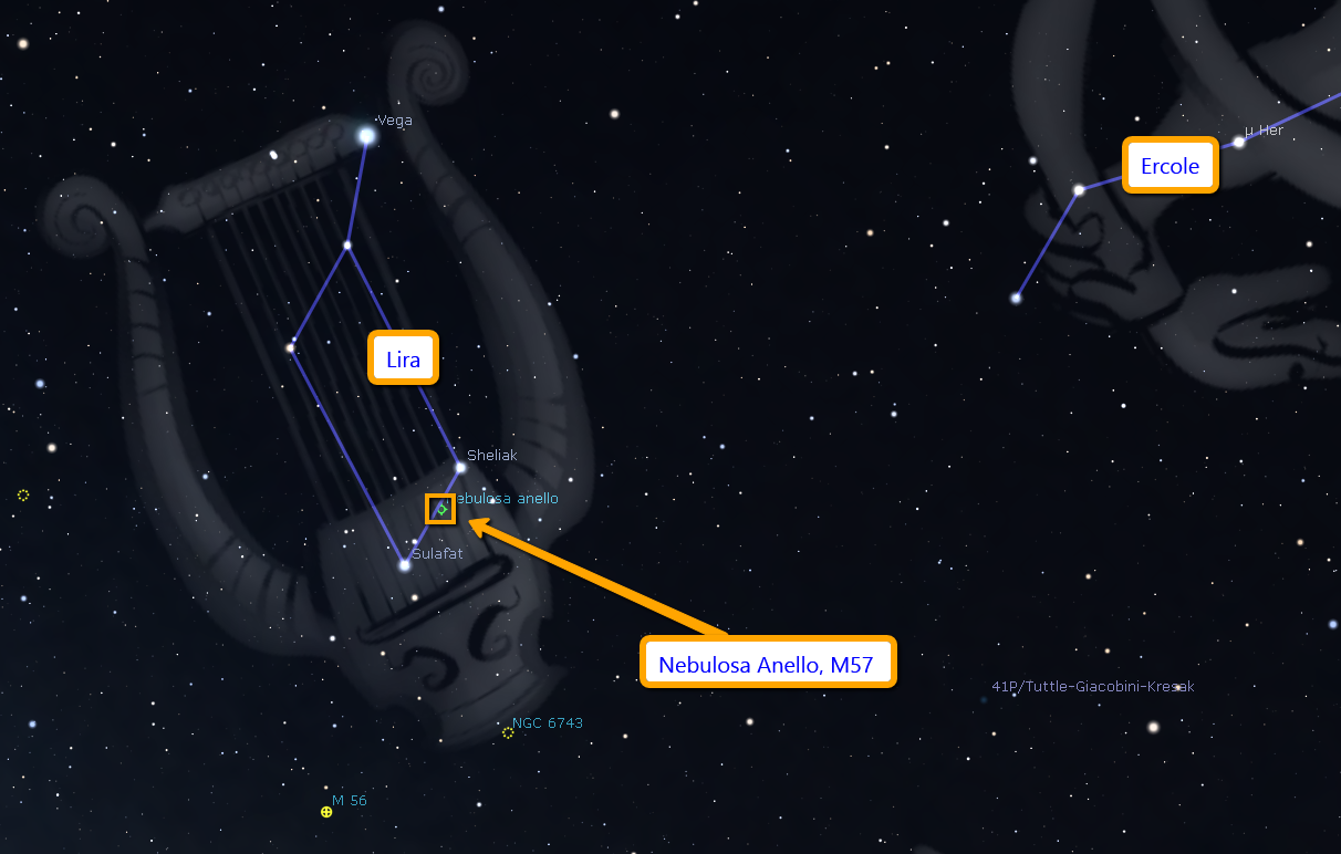Posizione di M57 rispetto alle stelle nella costellazione della Lira. Si noti, in basso a sinistra, l’ammasso globulare M56, anch’esso degno di nota.