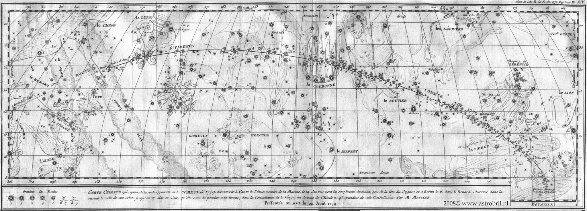 Era quindi osservando comete che, Messier, ebbe modo di trovare e catalogare questi oggetti nebulosi. Come spesso indicato nei suoi appunti, la presenza di quest’ultimi è stata inserita e segnalata, sotto forma di annotazione e disegno, nelle varie carte astronomiche da lui stesso redatte, volte ad indicare i movimenti e passaggi delle comete che, notte dopo notte, inseguiva nel buio. Il seguente è un interessante estratto della Carta della Cometa del 1779 dove, con il termine “Neb 1779” indicò i due oggetti nei pressi della Lira: M56 (di cui parleremo in altra sede) ed M57.